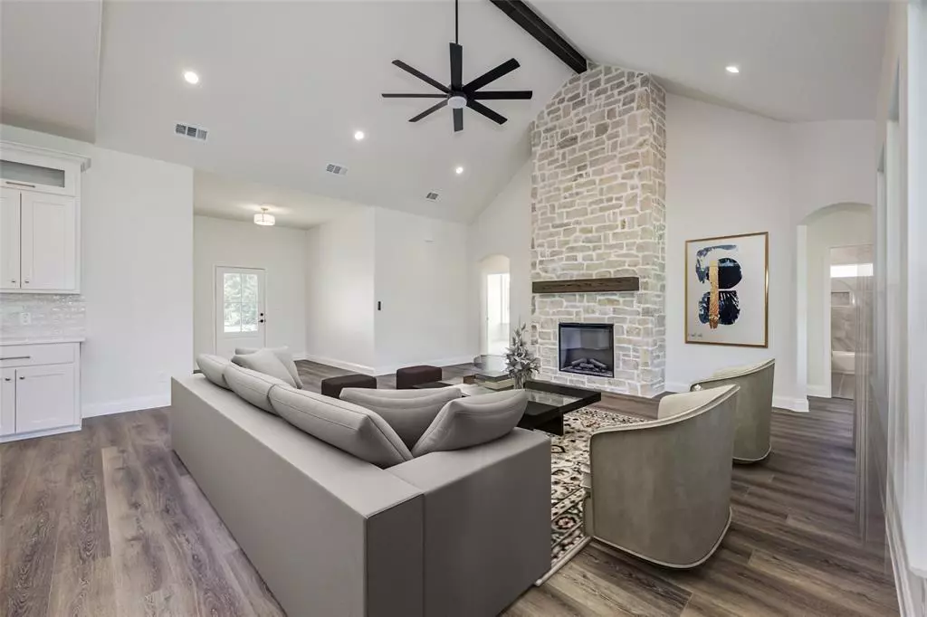 Features: Soaring vaulted ceilings in living room with floor to ceiling light colored stone fireplace, open concept, tons of windows giving natural light, Pegasus Marble an upgraded feature in the bathroom and kitchen, arched doorways, Bronze fixtures give a luxurious feel, spacious back porch, White bluff exterior brick exterior.