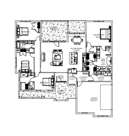 House Plan: COTTONWOOD 2323 sq ft. 4/3/2 The Cottonwood is a thoughtfully designed single-story home that blends open-concept living with functional comfort. This floor plan offers space and flexibility which families desire. At the heart of the home, the open living area features luxury vinyl plank flooring and a large stone fireplace with high beamed ceilings. The kitchen is seamlessly connected to the living space and comes equipped with modern appliances, large island and quartz countertops. A large bank of windows provides continuous light and views outdoors. The back porch has a high ceiling and cedar covered beams. The private primary suite is a peaceful retreat complete with an ensuite bathroom, large glass shower and stand alone tub. Three additional bedrooms and two full baths provide ample space for family, guests, or a home office. The Cottonwood offers room to enjoy the outdoors while maintaining the convenience of single-level living.